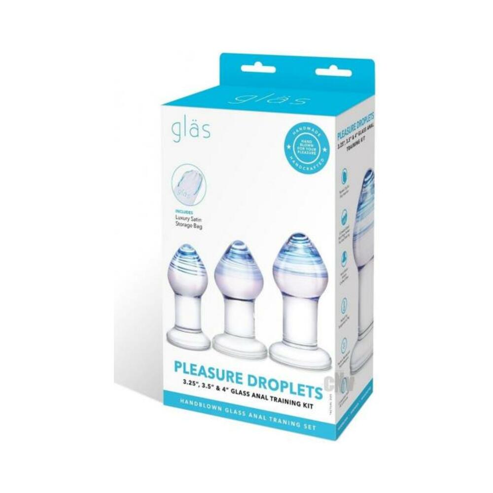 Explore the possibilities of anal training with 3 plugs in graduated sizes. Made of smooth, firm glass that`s easy to clean and body-safe, each plug is tapered for easy ion and features a flat, flared base that keeps it in place. Each plug features a beautiful combination of shades that adds to the pleasure.