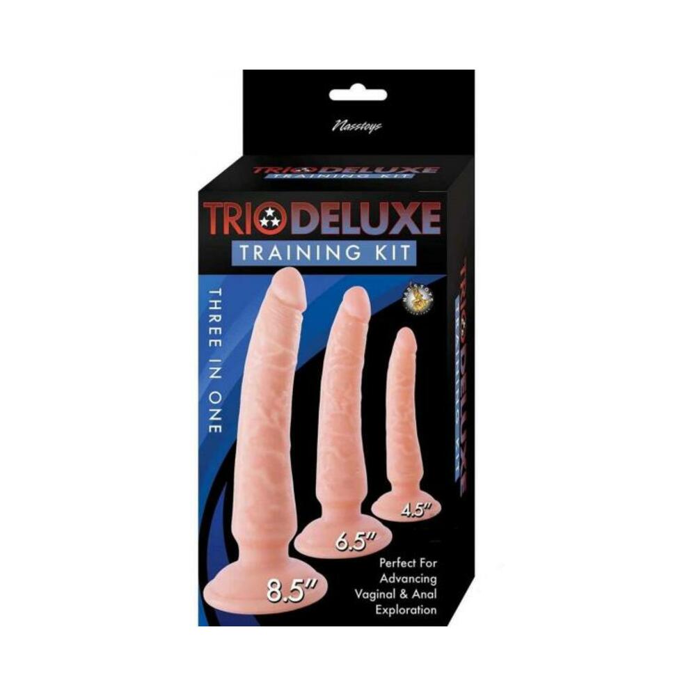 Three in one dildo kit Flexible dongs with suction cup bases Perfect For Advancing Vaginal and Anal Exploration Phthalates free Material: PVC Size – Large Dong: 8.5 x 1.75 in., Insertable Length: 7.5 in. Size – Medium Dong: 6.5 x 1.375 in., Insertable Length: 5.5 in. Size – Small Dong: 4.5 x 1 in. in., Insertable Length: 3.75 in.
