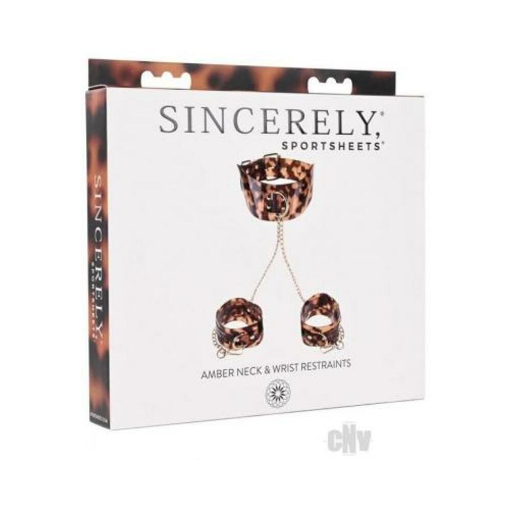 Transport yourself to a ravishing retreat with the Amber Neck and Wrist Restraints, created to help you submit to the sensations. The power is in their hands with chic gold-plated chains with easy clips for quick adjustments and passionate positions. Translucent tortoiseshell inspired material accents your skin for a foxy, fashionable feel.andnbsp;andnbsp;