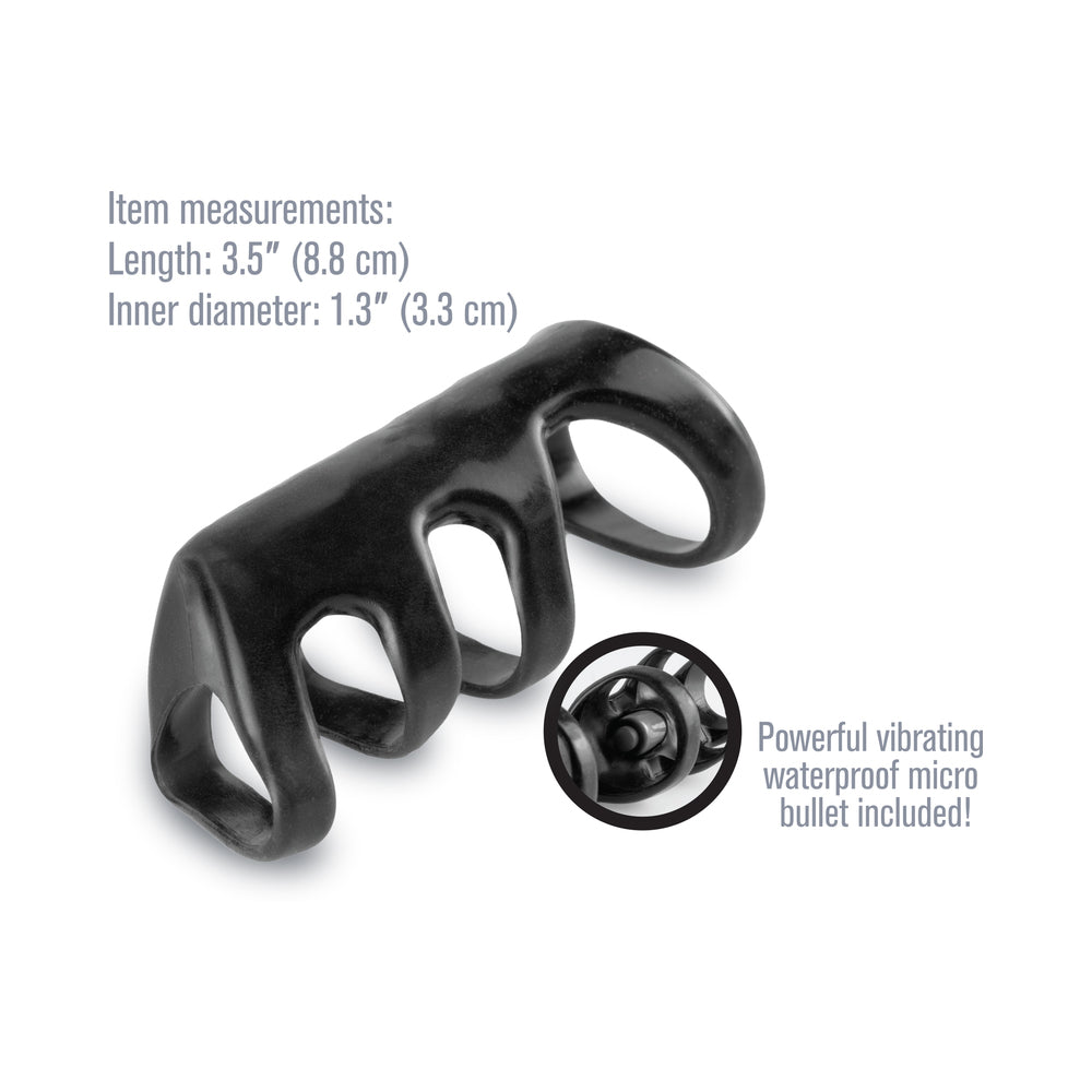 The Vibrating Power Cage is the ultimate erection enhancer. With four super stretchy rings wrapping around your penis, you will maintain rock hard erections and prolong the fun while you stimulate your partner. Hidden inside the cage is a powerful cordless micro vibe that delivers internal thrills with each thrust. You will enjoy thick, throbbing erections and your partner will love the cage’s added sensations. Features a powerful micro bullet. Includes freee batteries. Cage measures 3.5 inches long by 1.3 inches inner diameter.
