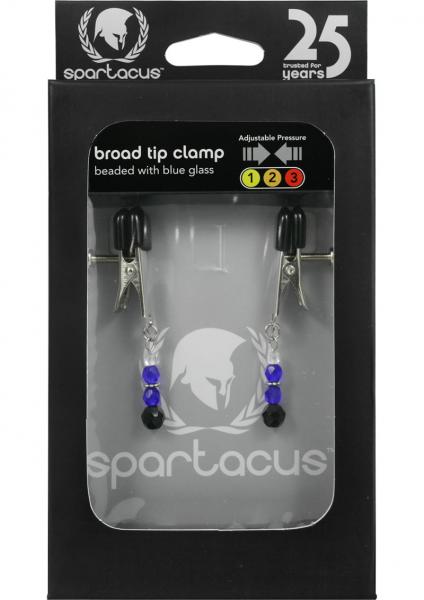 Adjustable wide alligator style beaded nipple clamps with sapphire blue beads. Soft rubber tips. Adjust the clamps by twisting the thumb screw from merely lovely decoration to pretty strong stimulation. Sold as a pair.