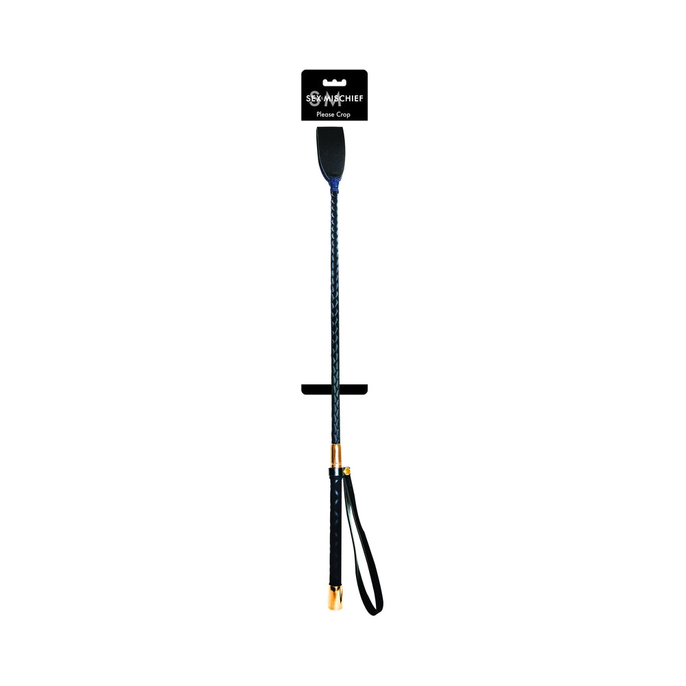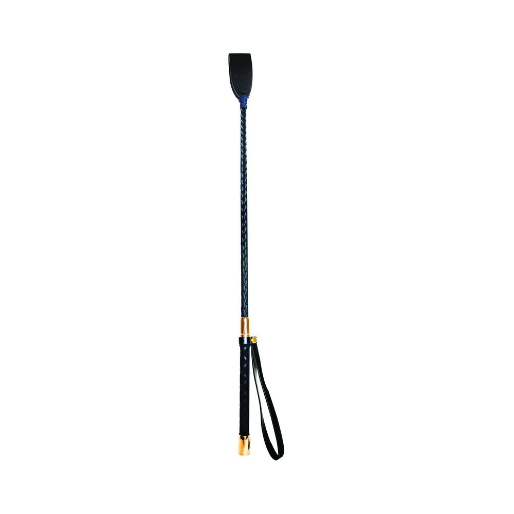 Hand-wrapped crop features tight webbing on the ribbon-braided shaft, a faux braided handle, rose gold caps and a black wrist loop. Entire crop measures 23.5 in. long.