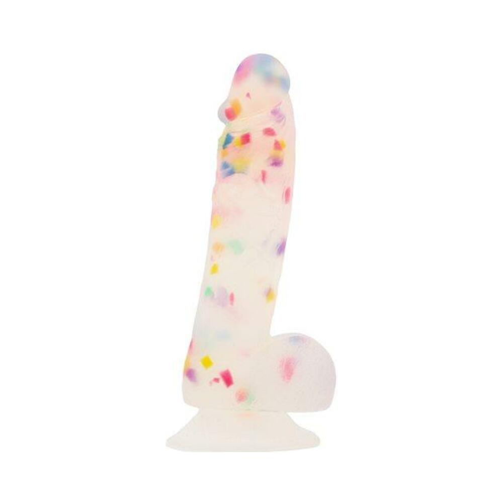 Addiction 100% Party Marty 7.5 inches Frost and Confetti from BMS Enterprise. The latest addition to the best selling Addiction collection of premium silicone dongs, Party Marty is here! Get the party started with this frosted silicone dong with a fun rainbow confetti design, and realistic texture. This dong has a superior suction cup and is harness compatible so you can decide how you want to play.