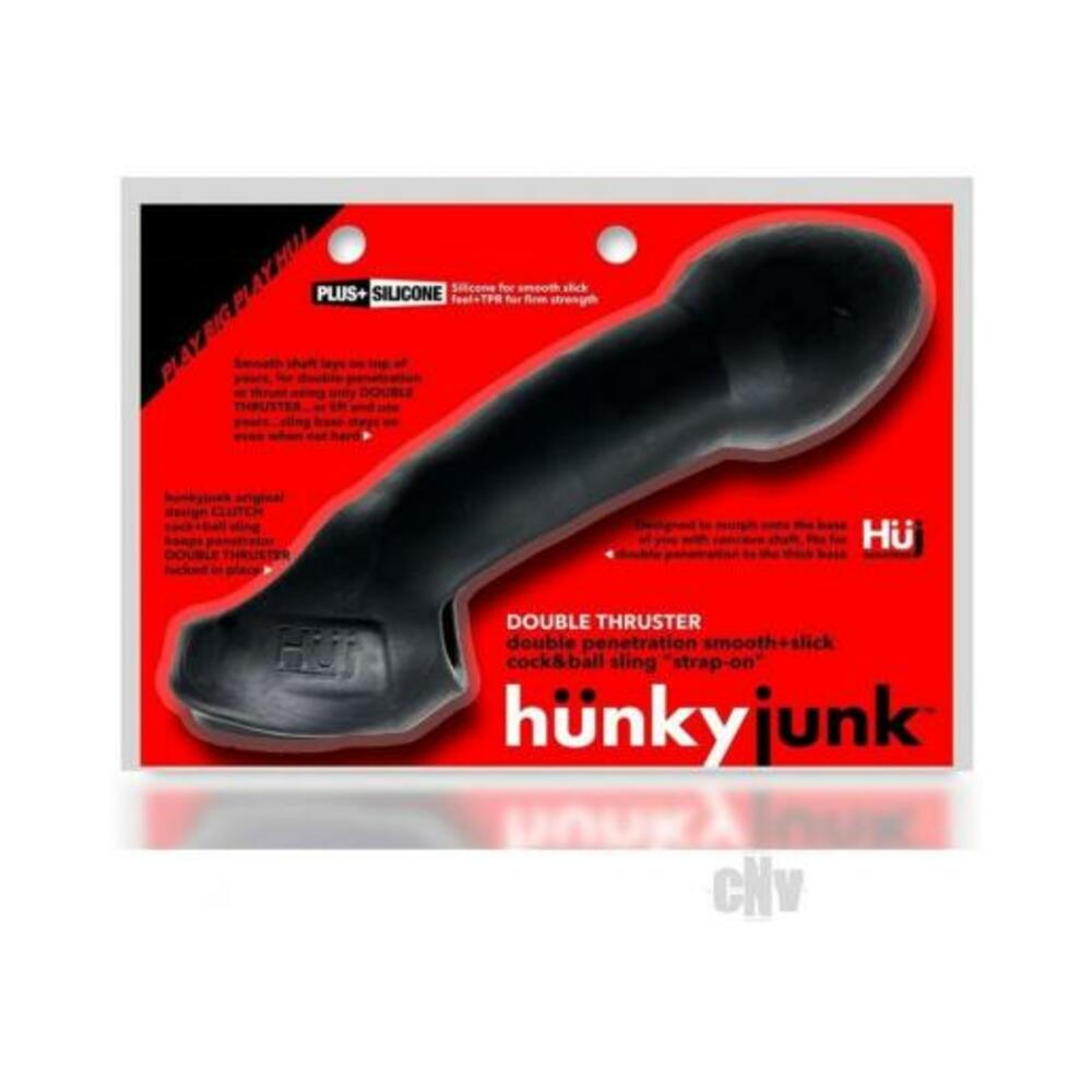 DOUBLE THRUSTER double penetrator by hünkyjunk DOUBLE THRUSTER: a cock sling-based strap-on double penetrator/pegger by hünkyjunk DOUBLE THRUSTER straps on your dick and balls with a cock-sling basethis one is CLUTCH, the thick rubbery design by hünkyjunkit attaches to you, no straps, no harnessit`s a second shaft you wear.andnbsp; The rubbery-firm Plus+SILICONE mix is designed strapping on and firm pegging and it stays in place. Designed by the boys at hünkyjunk this pegger is humpy funhünkyjunk knows how to make gear that makes your cravings realyou can use DOUBLE THRUSTER to double fuck, you can drop your shaft and use as a pegger, and it stays on even when you aren`t hard. The hünkyjunk guys obsess over making big toys that work, the right size gear for bigger better playthe pegger knob is kinda egg shaped for easy ion, the shaft is smooth and slickthe shaft lays on top of your meat with a concave indentation at the base so your dick and DOUBLE THRUSTER morph together at at your cock and balls while the end of the shaft and the head are separate for max feel.andnbsp; HOW TO: a bit of light lube on your junk, slide shaft through front hole to base, then pull up while standing to drop ballsack through bottom hole. Made of exclusive Plus+SILICONE blend with a lush dull velvet feel and a warm fleshy stretch.andnbsp; Hünkyjunk makes the toys that work hard, look hot and are super hünky for your junk FRACTAL is an original design copyright hünkyjunk Plus+SILICONE blend non-toxicand phthalate free. LUBE SAFE:andnbsp; Water-based or silicone. CARE:andnbsp; Wash after use in warm soapy water, air dry.andnbsp; Store toys separately:andnbsp; we recommend breathable cloth pouches or cotton socks. andnbsp; INFO: No straps, no harness cocksling based strap on pegger Designed to double penetrate or wear as a strap-on pegger CLUTCH cocksling base is thick and meaty, this stays on Shaped to lay on top of shaft and morph at the base Plus+SILICONE matt velvet finish silicone/TPR blend andnbsp; MEASUREMENTS/WEIGHTS PRODUCT: Length: 8/20 cmWidth: 1.5/4 cm Depth: 1/3 cmShaft hole diameter: 1/3 cm Ball hole diameter: 1.5/4 cmMax able shaft length: 6/5 cmInsertable shaft circumference: 5-6.5/13-17 cmProduct weight: 7 oz andnbsp; PACKAGING DIMENSIONS: Length: 8.5/22 cm Width: 6/15 cm Depth: 2/5 cm Package weight: 9 oz andnbsp;