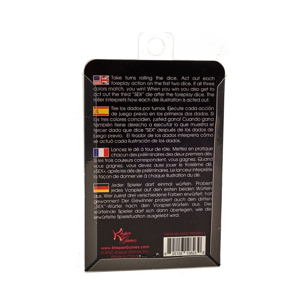 Match three colors to get lucky. Take turns rolling the dice and interpreting foreplay actions. When you win, you and your lover get to act out the Sex die.