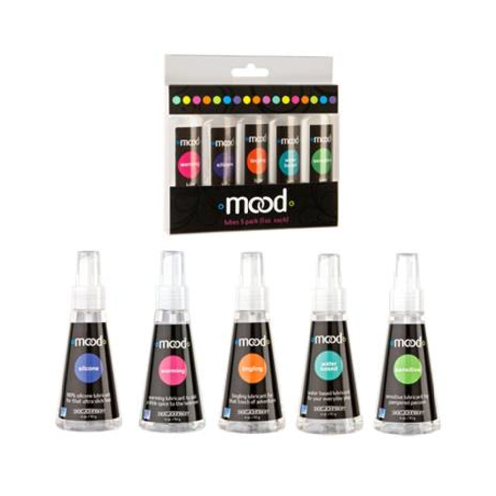 Mood Lube 5 Pack 1 Oz Each Five premium lubricants, one for every mood! This 5-pack features the whole set of mood lubes in cute 1 ounce tubes! Includes Silicone for that ultra slick feel, Warming to add a little spice to the bedroom,Tingling for that touch of adventure, Water-Based for your everyday play, and Sensitive for pampered passion. You will always be in the Mood once you’ve used these pleasure potions. Get ready, get set, get in the mood! Water-based and silicone formulas included bottles per set; each bottle is 1 oz. Sensations: warming, cooling, tingling. Made in the USA.
