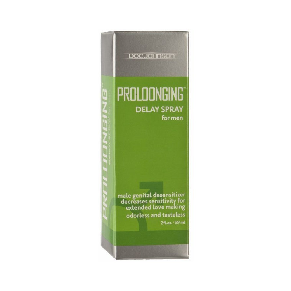 Proloonging Delay Spray when sprayed 10 minutes before contact, this spray slightly desensitizes the penis to decrease sensitivity to prolong intercourse. Odorless and tasteless. Contains 7.5% Benzocaine which acts as a desensitizing agent to help the man maintain and prolong his erection and help delay or prevent premature ejaculation. This product can also be more helpful when used along with a cock ring. Just one spray makes your pleasure last a lot longer! These odorless and tasteless products allow you to delay ejaculation and orgasm until you are ready to let it go. Apply to decrease sensitivity and extend your lovemaking. It is fast, effective and greaseless too, so it won’t stain your sheets or her sexy lingerie. 2 ounces. Lotions/Potions & Aphrodisiacs from Doc Johnson Novelties. Made in the USA.