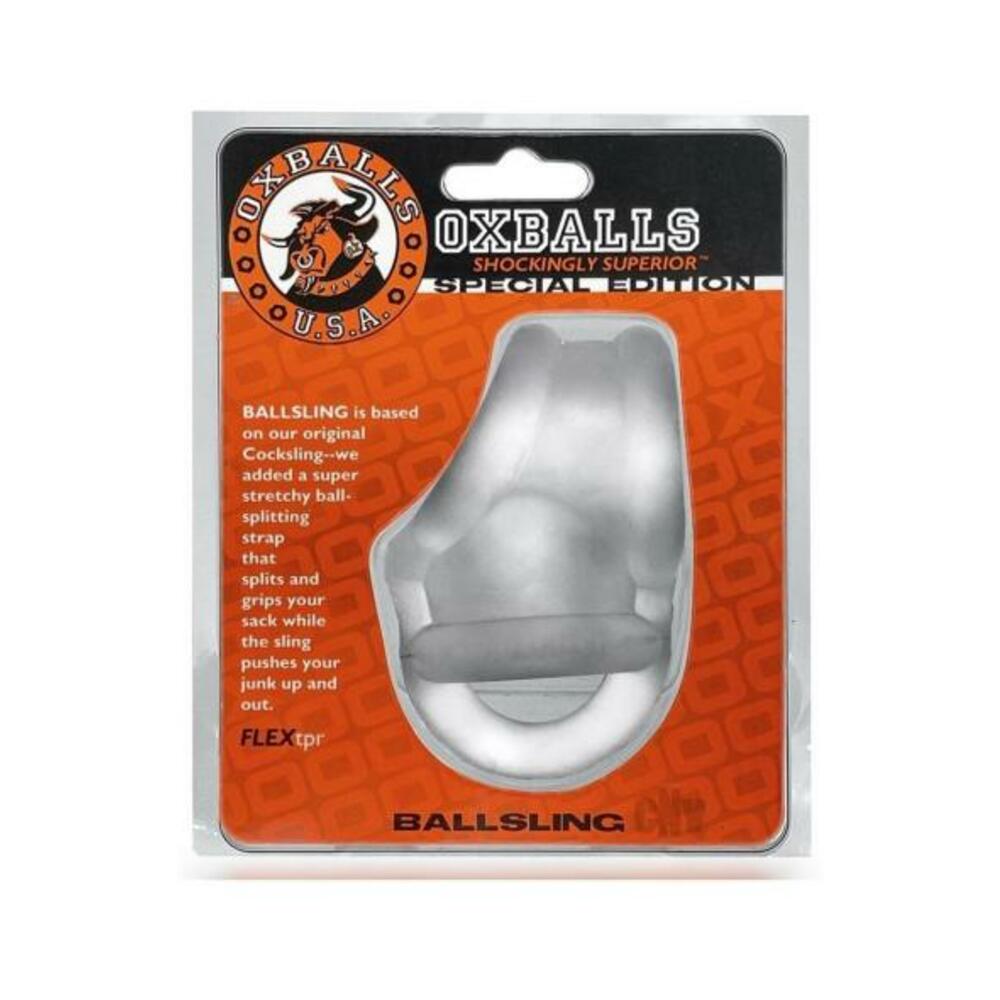BALLSLING Redesign of our best-selling older model SPLITSLING Modeled after our original COCKSLING but with a built-in ball-splitter Thick ring at the base keeps balls in place and pressed against the splitter strap Made from our signature super-soft, stretchy FLEXtpr Pushes package up and away from body for a bigger bulge andnbsp; INFORMATION: BALLSLING is a special limited edition cocksling modeled after our discontinued, best-selling SPLITSLING. It`s made from our signature FLEXtpr so it`s blubbery and squishy but still firm enough to stretch and split your sack. The stretchy, soft material and sling design grips your meat and pushes your package up and out for a bigger bulge. The thick ring on the base of the sling keeps your balls in place and pushed down on the blubbery splitter strap.—————————————————————————–You asked for it and we delivered, introducing the special edition cocksling and ball-separator, BALLSLING.BALLSLING is everything you love about our original COCKSLING design but it`s thicker, softer and even more bang for your balls.BALLSLING has a built-in sackring at the base and a thick strap of FLEXtpr that pushes down on your ballbag and acts as a separator.The ring keeps your balls anchored down in the sling and the separator forces your nuts downward and away from each other for a sweet stretching sensation.It`s made from our signature FLEXtpr so it`s super blubbery and squishy but still firm enough to squeeze and separate your sack. Your nuts have never experienced anything like this.It`s perfect for guys who like having their jewels handled or to present your balls for a serious CBT scene.BALLSLING also doubles as a bulge enhancer to fill out your favorite jockstrap pouch or some tight gear. SIZE/DIMENSIONS AND WEIGHT: Width: 2Height: 3Main hole circumference: 4.25Shaft hole Circumference: 3.75Ball hole circumference: 3.25Weight: 1.5 oz MATERIAL AND CARE INSTRUCTIONS: Original design copyright OXBALLSFLEXtpr safe, strong, non-toxic and phthalate free.LUBE SAFE: Water-based or silicone.CARE: Wash after use in warm soapy water, air dry. Store toys separately: we recommend breathable cloth pouches or cotton socks.