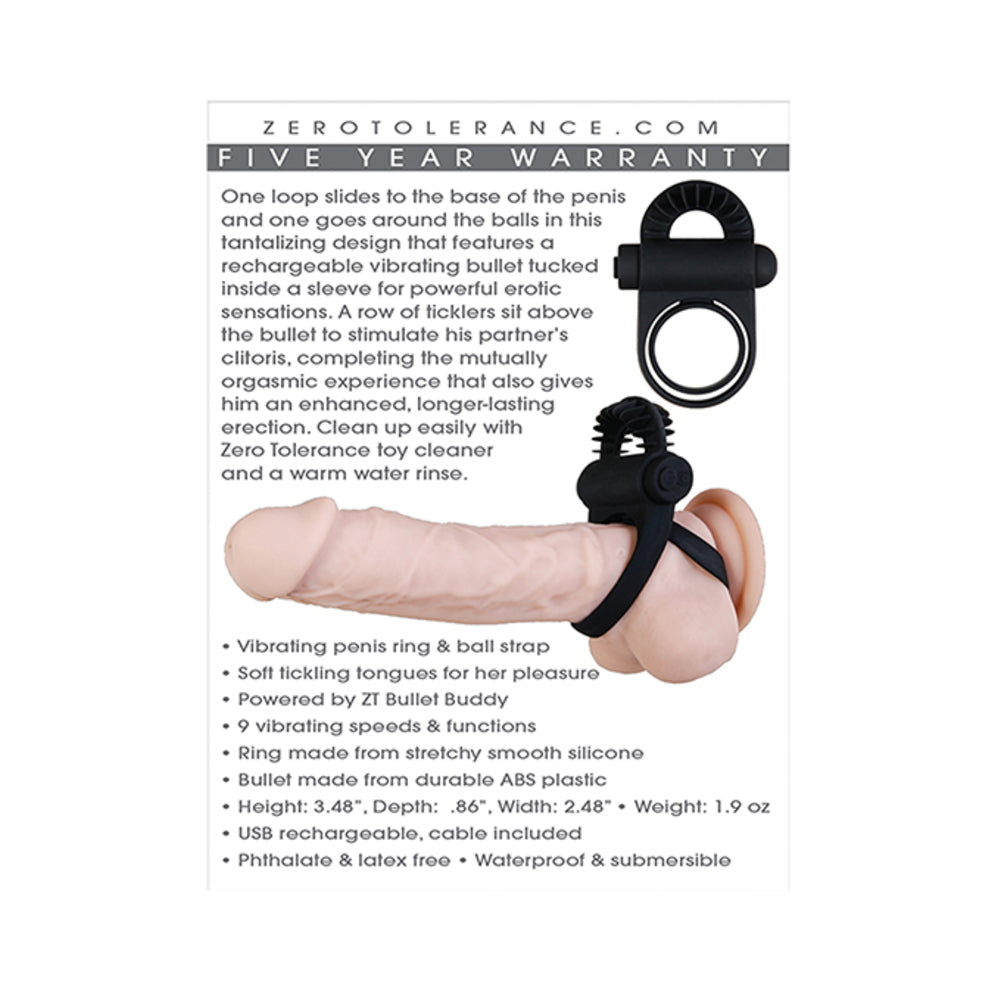One loop slides to the base of the penis and one goes around the balls in this tantalizing design that features a rechargeable vibrating bullet tucked inside a sleeve for powerful erotic sensations. A row of ticklers sit above the bullet to stimulate his partner’s clitoris, completing the mutually orgasmic experience that also gives him an enhanced, longer-lasting erection. Clean up easily with toy cleaner and a warm water rinse.