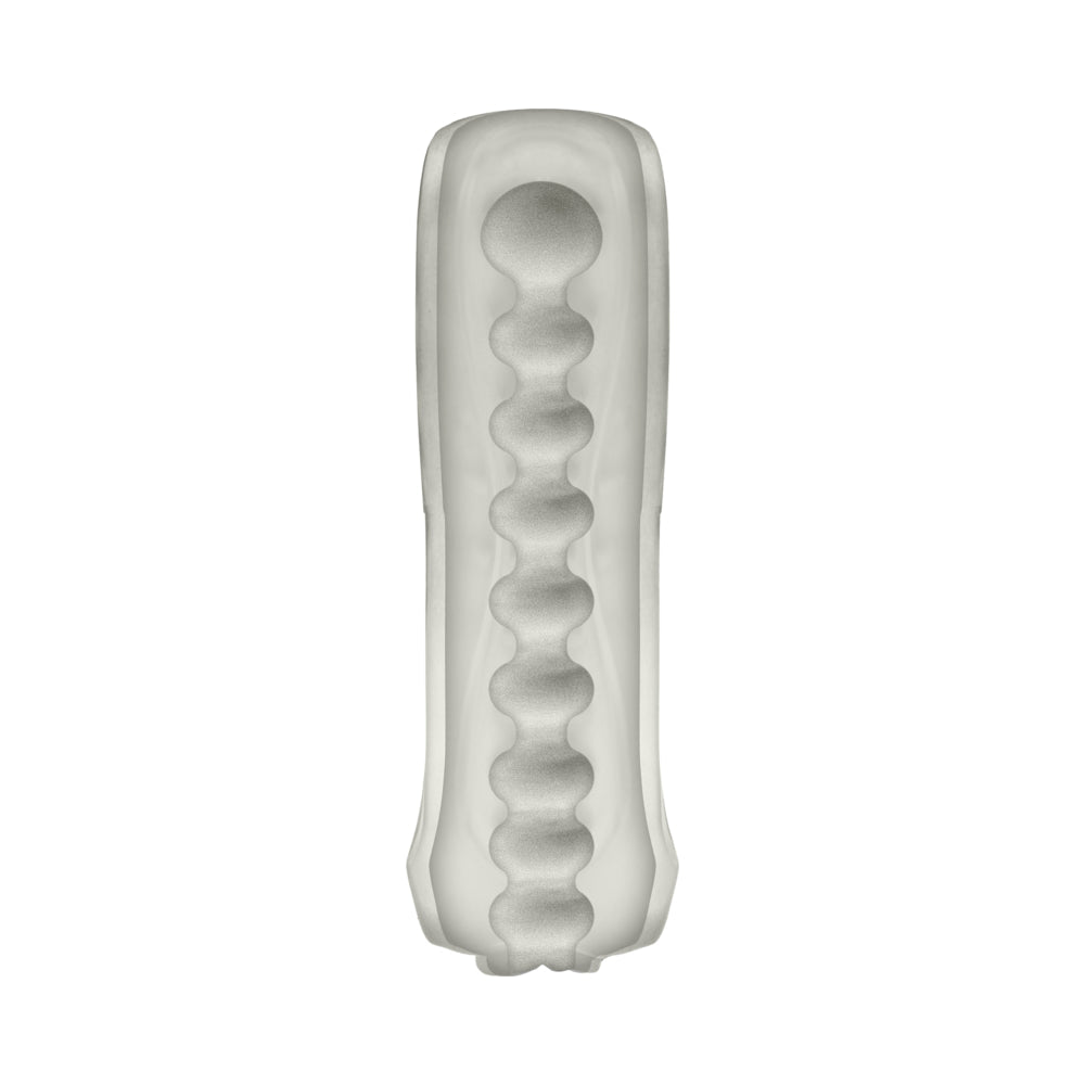Pocket masturbator features stimulating massage beads on the inside for intense satisfaction, with a closed end design for extra suction. Made of UR3, a lifelike Thermoplastic Elastomers TPE material. Length is 9 inches, width 2.6 inches.