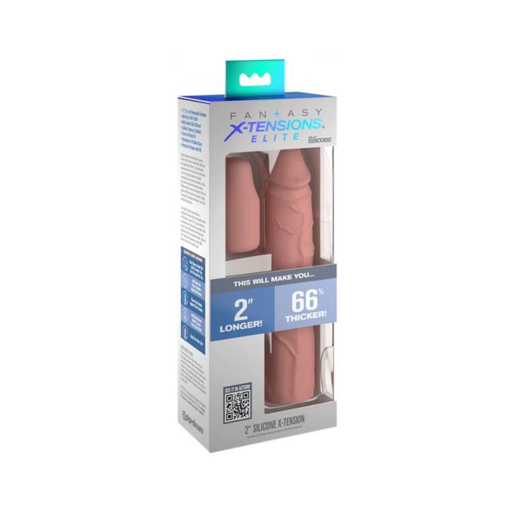 Instantly transform your penis into a pleasure machine with Fantasy X-tensions Elite! Made from ultra-hygienic Elite Siliconeandtrade;, this performance-enhancement sleeve fits like a glove and feels like a second skin, giving wearers extra length, increased girth, and maximum confidence. Satisfy your partner and avoid embarrassing midway letdowns with your new secret weapon! Perfect for people with ED and performance anxiety, Fantasy X-tensions Elite enhancers will deliver results both partners will appreciate.Your silicone Fantasy X-tension Elite is a customizable extension that can be easily trimmed at the base for a perfect fit. Itandrsquo;s super-stretchy to accommodate most sizes and snug enough to help you last longer. Both partners will enjoy deeper penetration with the removable extender, while the ultra-realistic sleeve makes the wearer 66% thicker all around. This could be you! KEY PRODUCT FEATURES andbull; 2 (5.1 cm) removable extenderandbull; Adds up to 66% girthandbull; High quality Elite Siliconeandtrade;andbull; Lifelike textures andamp; detailsandbull; Trim for perfect fitandbull; Stretches to fit most sizesandbull; Perfect for people with ED