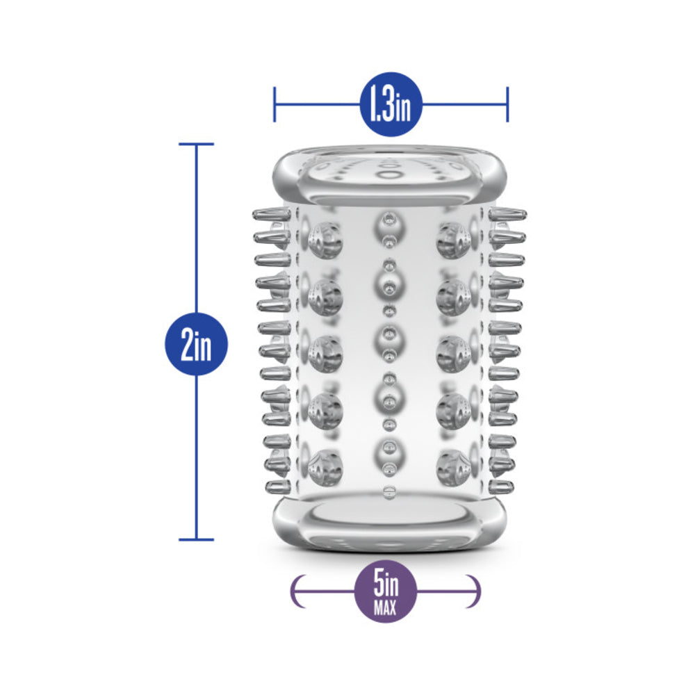 Stretchy and textured enhancement sleeve adds pleasure and sensation. Just slide over your shaft or a dildo. One size fits most. Measures 2.04 inches long, 1.57 inches diameter, 4.92 inches circumference.
