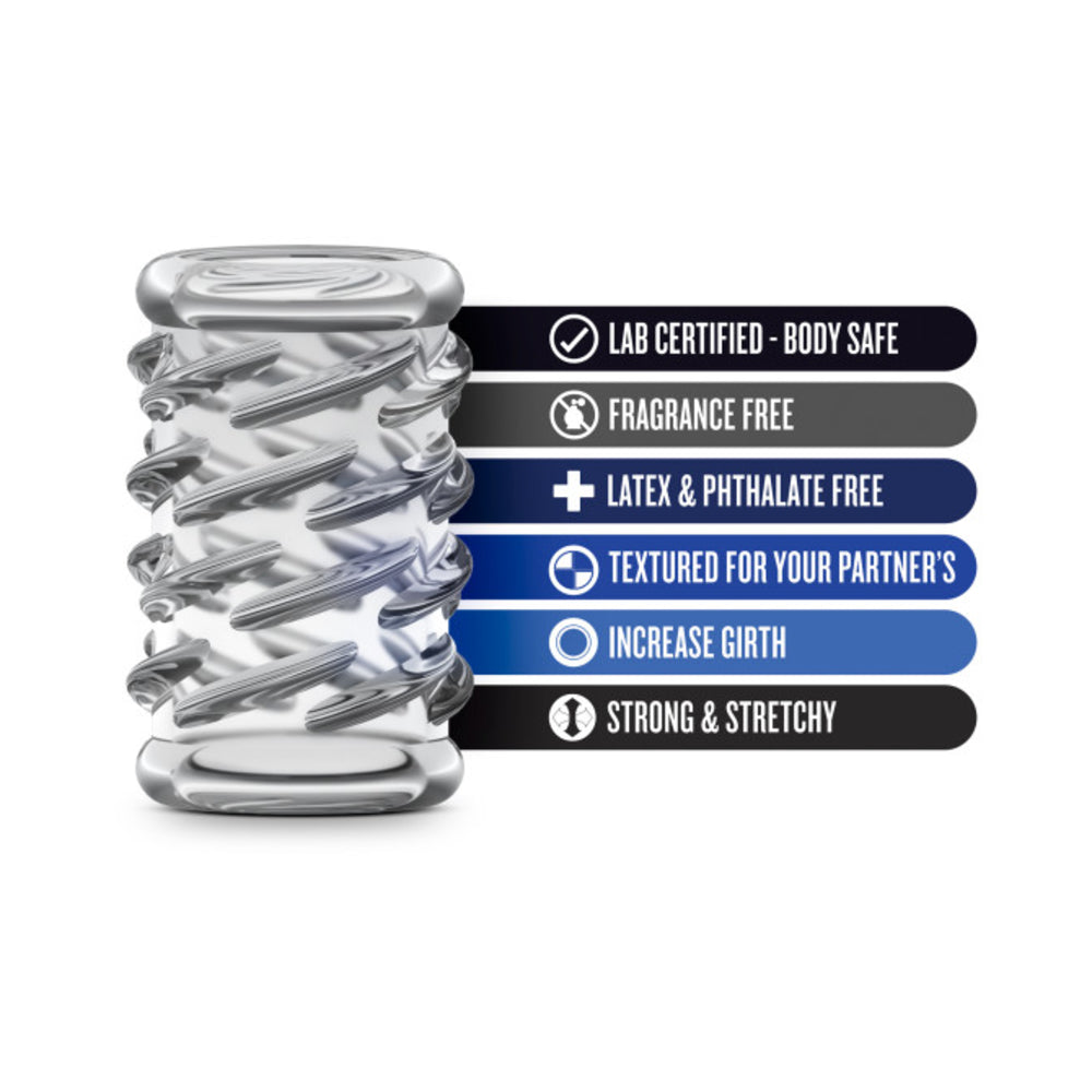 Stretchy and textured enhancement sleeve adds pleasure and sensation. Just slide over your shaft or a dildo. One size fits most. Measures 2.04 inches long, 1.57 inches diameter, 4.92 inches circumference.