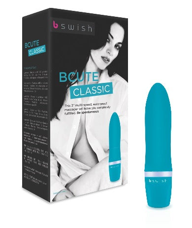 Bcute Classic Vibrator Jade be adventurous, be fulfilled with this 3 inches waterproof silicone multiple speed massager. Enjoy its silky touch in the bath or anytime. Be adventurous; be fulfilled with this waterproof silicone massager. Enjoy its silky touch in the bath or anytime. B Swish redefines the classic massager with this 3″ waterproof silicone multi-speed wonder. let its silky touch guide you from whisper-soft caresses to an explosive massage. All Bcute Vibrators now come with a color coded twist cap. Bcute classic vibrator specifications: materials ABS plastic, silicone. Vibrator measures 3.9 inches long by 0.8 inch wide. Vibrating sex toy requires 1 AA battery, not included. Use time approximately 3 hours. Functions multiple speeds of vibrations. Waterproof vibrations for play outside the bedroom. Box contains: 1 massager, 1 pouch, 1 instruction booklet.