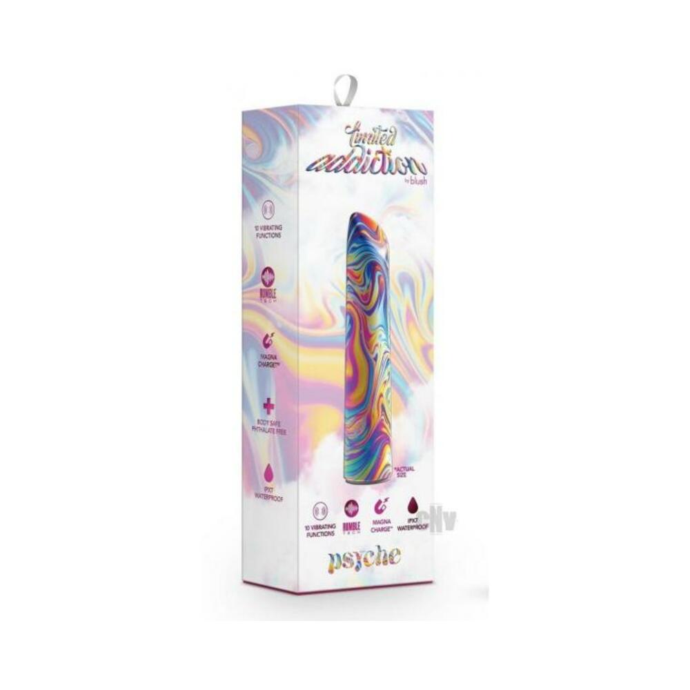 Are you ready for your newest addiction? The Limited Addiction Psyche Power Vibe is a colorful and sleek vibrator that delivers 10 deep, rumbly vibrations with the superior Rumble Tech motor! Cycle through 5 powerful speeds and 5 unique and thoughtfully curated patterns using the two button design to find your perfect pleasure preference. IPX7 submersible waterproof for bath and shower play and USB magnetic rechargeable, the Psyche Power Vibe is easy to clean and even easier to use. It has a smooth, sensual satin feel and it contains no phthalates, paraffins, latex, or fragrance.