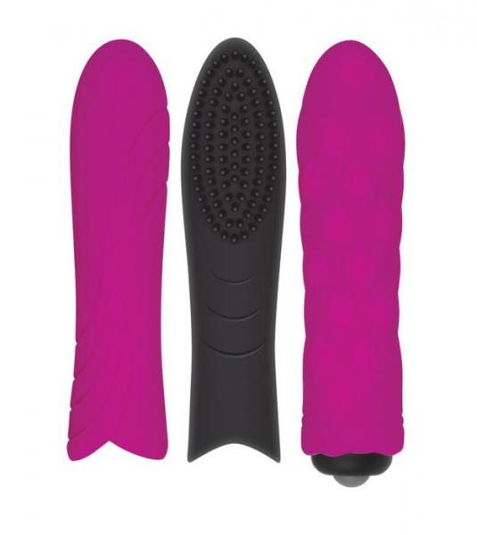 Pleasure Sleeve Trio with Black Bullet Vibrator. Sleeves are made using phthalate free materials Silicone. Bullet vibrator is made using ABS plastic. Pleasure Sleeve Trio This erotic bullet kit lets you choose length and texture according to your mood and desire! With a preppy 10 function bullet that cycles through all your favorite speeds and vibration modes, you can try out three separate sleeves to slip over top! One has quilted tufts, one a sexy bulb-shaped ending, and third is longer with pleasure nubs and rippled textures! You decide what experience you prefer each time, and enjoy water play in bath or shower, as it is completely submersible! Clean up is easy with toy cleaner and warm water rinse. Features: made from luxurious silicone. 3 interchangeable sleeves for different experiences. 1st sleeve is 3.75 inches long, .9 inch wide with a smooth, bulb shaped tip for sensual stimulation. 2nd sleeve is 4 inches long, 1 inch wide and features pleasure nubs above and erotic ripple texture below. 3rd sleeve is 4.75 inches long, 1.25 inches wide with a tufted, quilted texture for comfort and pleasure. Bullet has 10 separate speed and vibration functions. Waterproof vibrations. Easy to clean. Latex free and phthalate free. Vibrator requires 1 AAA battery, not included.