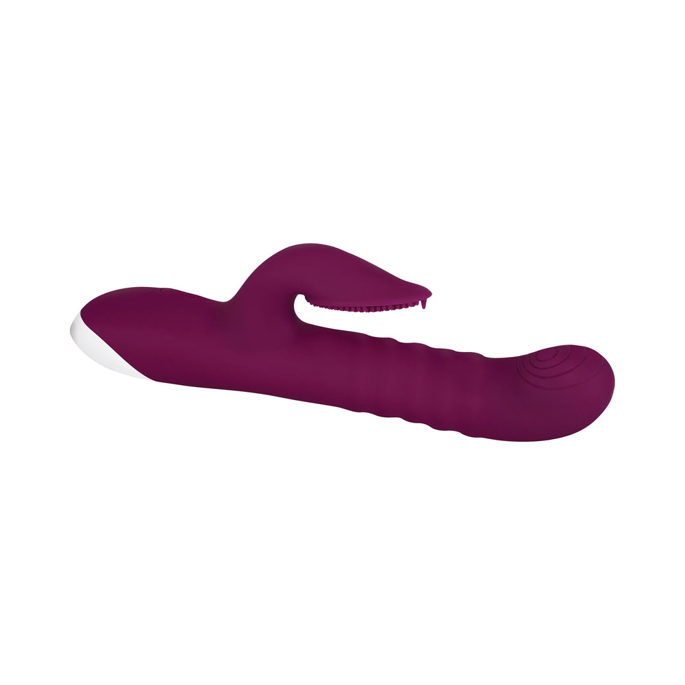 Satisfy multiple pleasure cravings at once! Two powerful motors deliver an extraordinary combination of sensations – thrusting, spinning, internal and external vibration – not to mention the quivering nubs that dance all over the clitoral shaft platform. Choose from 3 thrusting and spinning speeds, and adjust the 10-speed clitoral shaft to find the perfect blend that makes your toe-curling fantasies come true, even under water as it’s completely submersible. Clean with Evolved Toy Cleaner and a warm water rinse. Thrusting, spinning dual vibrator Perfect for internal/external pleasure Shaft head thrusts and rotates Rotating beads in shaft for extraordinary sensation 3 thrusting & spinning speeds, operated together Main shaft thrusts up to half an inch Vibrating nubs on clitoral shaft for intense stimulation 10 vibrating clitoral shaft speeds & functions Slightly curved main shaft & circular texture on G-Spot point Stylish white pearl finished handle Easy to use 2-button control panel LED illuminates buttons when in use Made from creamy smooth silicone Detail made from durable ABS plastic Height: 9.5”, Depth: 2.83”, Width: 1.68” Weight: 11.4 oz Phthalate & latex free Rechargeable, USB cable included Waterproof & submersible
